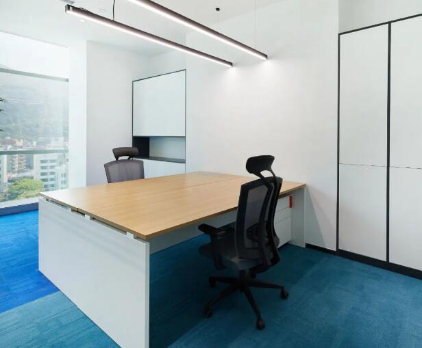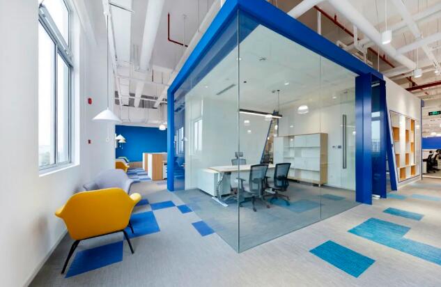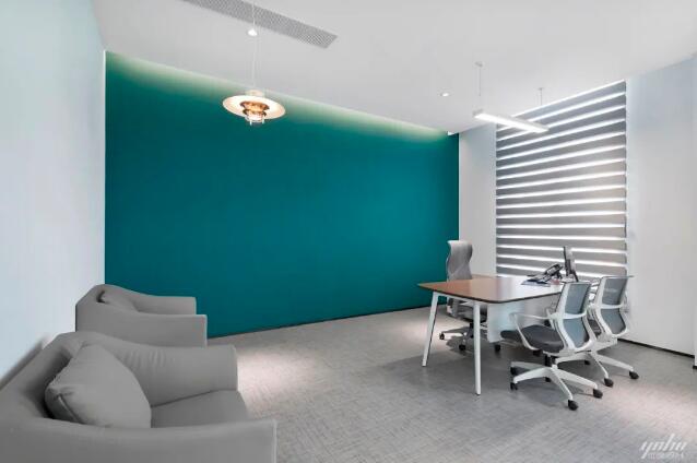 工作区被做成了模块化的分割,经理室处于这片工作区的核心筒位置,由原点向四周进行辐射,功能优化了效率沟通的机制。中心的办公室光线通透,除了能吸纳到第一手采光,也能放眼办公室外的一切状况。设计师使用蓝色作为这片空间的主色调,为使用者创造了一个沉浸式的工作氛围。