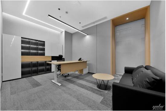 作为一家智慧能源物联网企业,CHINT具有作风严谨、理性有序的特性。因此,经理室的色彩基调定义为白色调,体现简洁干练和理性,设计创造出一种天然的严肃和高格调的疏离感。同时,在办公家具的选择上,地毯用以活泼的蓝色,给人以积极、明亮的心理暗示。