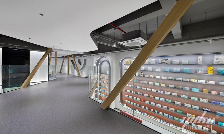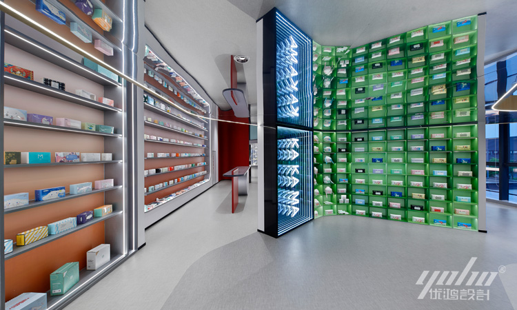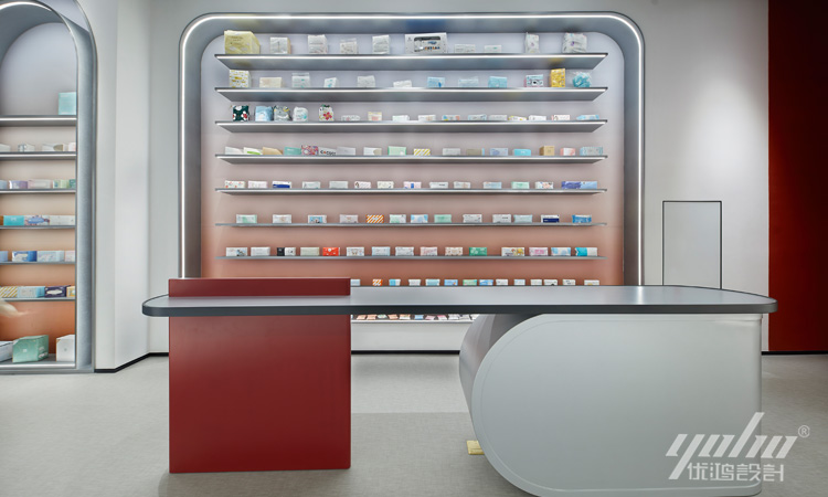 红色冲击人们的视觉感受带来强烈的专注力。设计师通过打造各类形态的产品展示区,丰富了产品的陈列布局,以点串线,以线成面,皆能产生不同的视觉体验与心理感知。