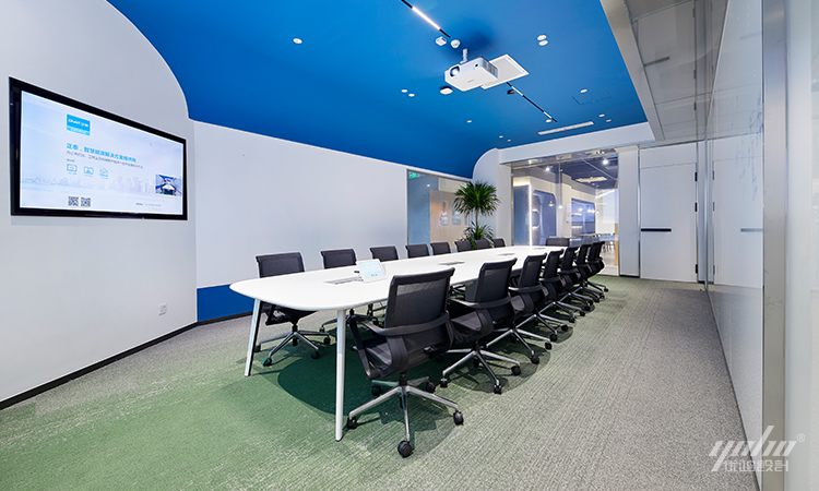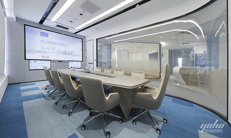会议室设计需求做为空间功能之一,有近三分之一的空间被用作会议空间使用。造型多以立体几何结构做一些导向性,营造空间的多样化。色块的灵感来自于蒙德里安,垂直水平的线条分割,揭示出色块的灵动与韵律。