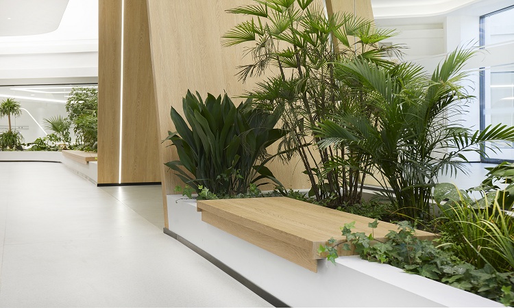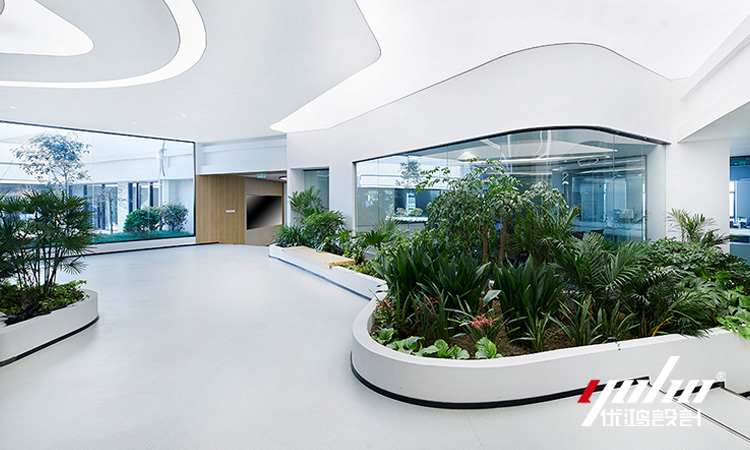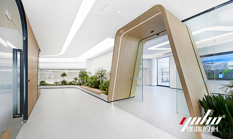 利用线条和灯光勾勒出简约之美,线条是项目的精髓。本案用线和面构建出简练优雅的设计美感。空间的分隔用弧形以此实现,再铺陈大面积的绿植造景,丰富室内的生态和灵动。