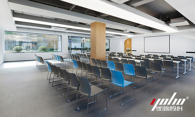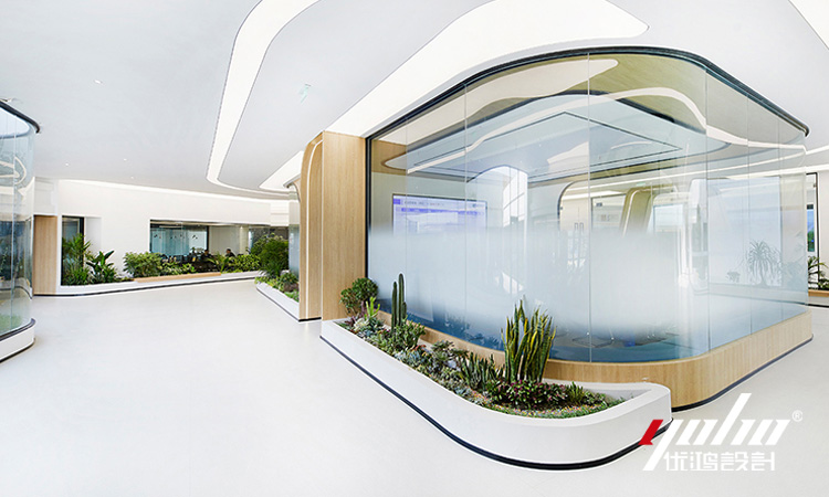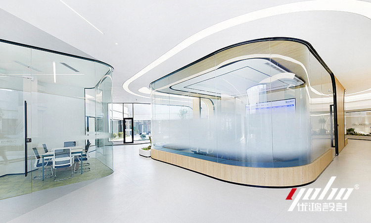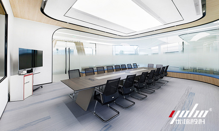 蜿蜒的弧形设计感极强,带来震撼的视觉效果。美化形体感的同时又拉伸纵向挑高;玻璃隔墙增强空间通透性效果,带来清晰的视觉感受。会议室内部以简洁一致的色调为主,充分尊重空间的整体感,用弧形化解了空间棱角,使之圆润可爱,在干净简洁的空间里注重舒适性是对于使用者的人文关怀。