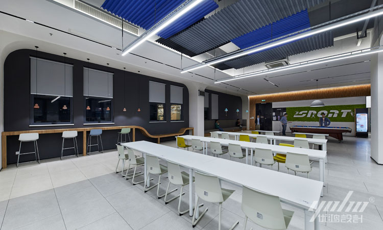 餐厅作为科瑞办公大楼的休闲缓冲区,不仅承担了餐饮功能,还融入了休闲娱乐的多元化场景。各场景相互交叉、分离、包容组合而成,彻底实现了一个空间多重使用。