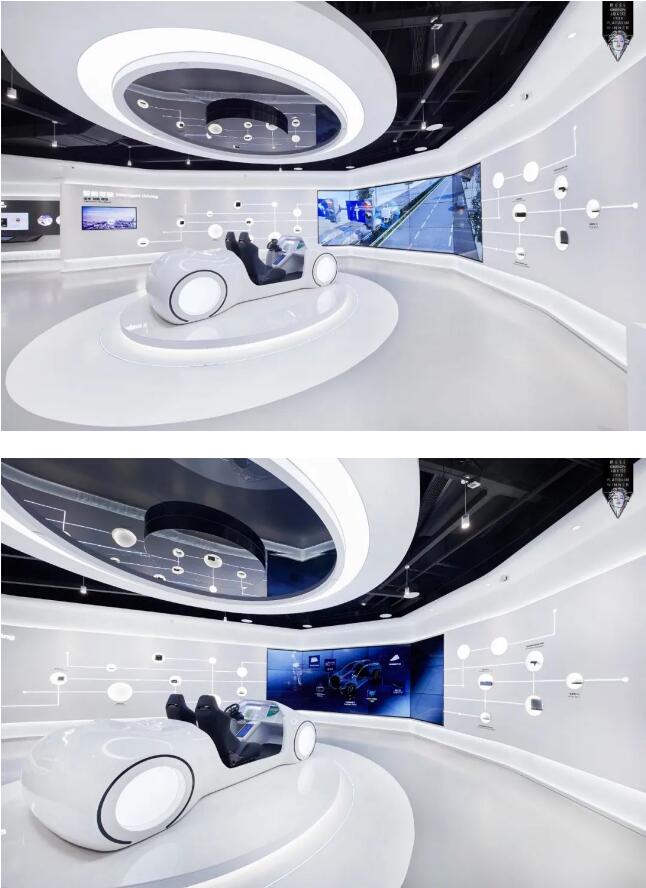 圆形线光把天花和地面展台相互呼应,形成一个富有设计调性的空间。将汽车模型陈列在白色人造石圆台上,通过圆台和灯光的叠加营造出漂浮于空中的错觉。正前方所对应的270°广角屏可感受与之匹配的视觉特效,这里既满足展示服务功能,也成为了共享体验空间。